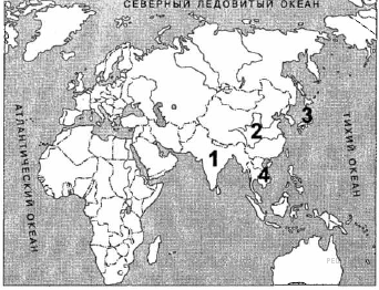 Территория государства, которое в 1945 г. подверглось атомной бомбардировке, обозначена на карте цифрой: